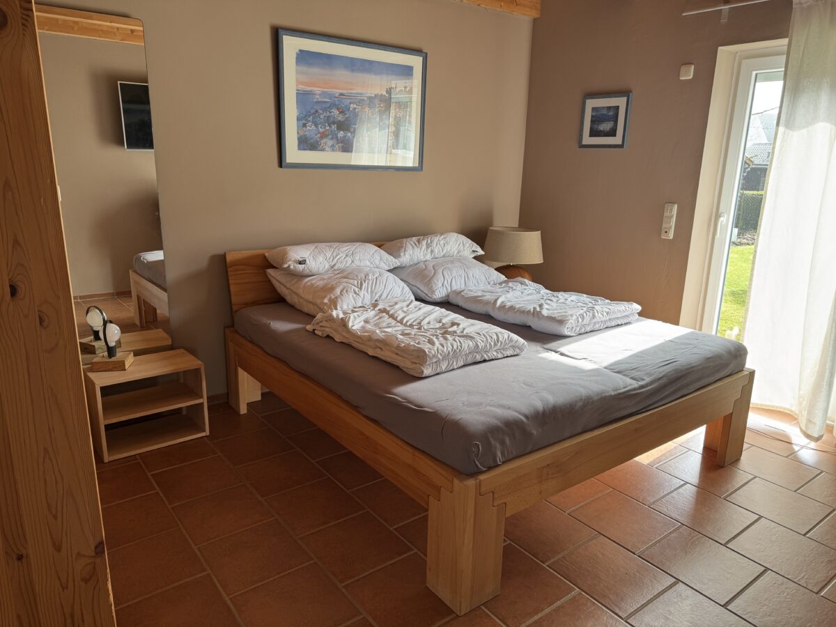 Schlafzimmer mit großem Doppelbett & der offene Schlafboden oben